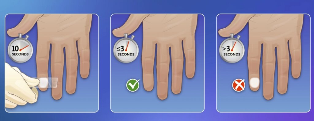 Die CRFT wurde ventral an einer Fingerbeere gemessen: Ein Glasblättchen wurde bis zum Abblassen der Haut auf die Fingerbeere gedrückt und der Druck wurde für 10 Sekunden gehalten. Anschließend wurde der Druck abrupt beendet und die CRFT gemessen. Als abnormaler Befund wurde eine CRFT > 3 Sekunden gewertet (Abbildung 1). Die CRFT wurde nach jedem Flüssigkeitsbolus nach einem strikten Behandlungsalgorythmus gemessen und weitere Flüssigkeitsboli, bei adäquater myokardialer Pumpfunktion, bis zur Normalisierung der CRFT verabreicht.