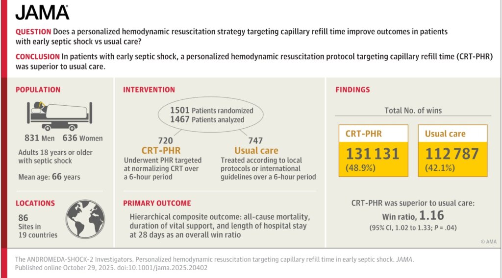 Hernandez G et al. Personalized hemodynamic resuscitation targeting capillary refill time in early septic shock. The Andromeda-Shock 2 randomized clinical trial. JAMA 2025; 334: 1988-1999